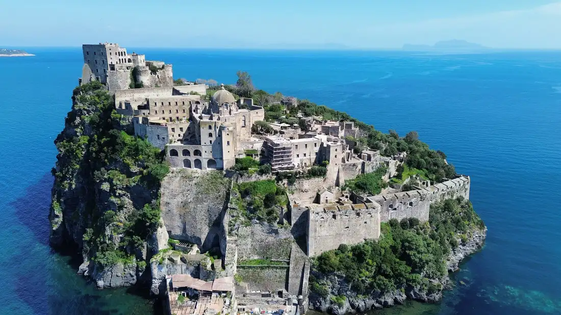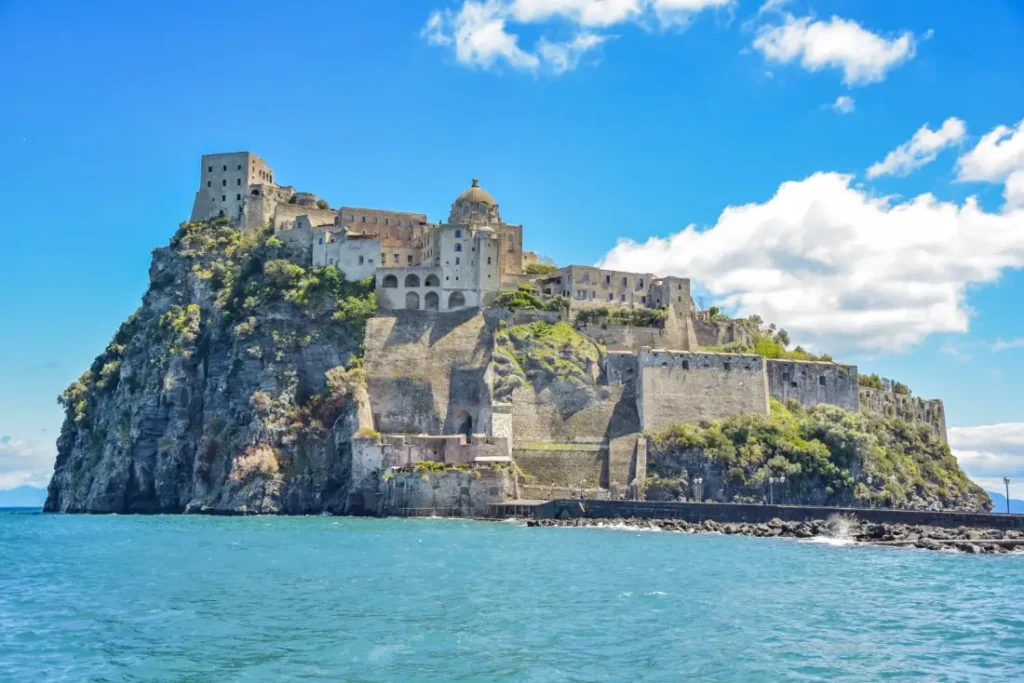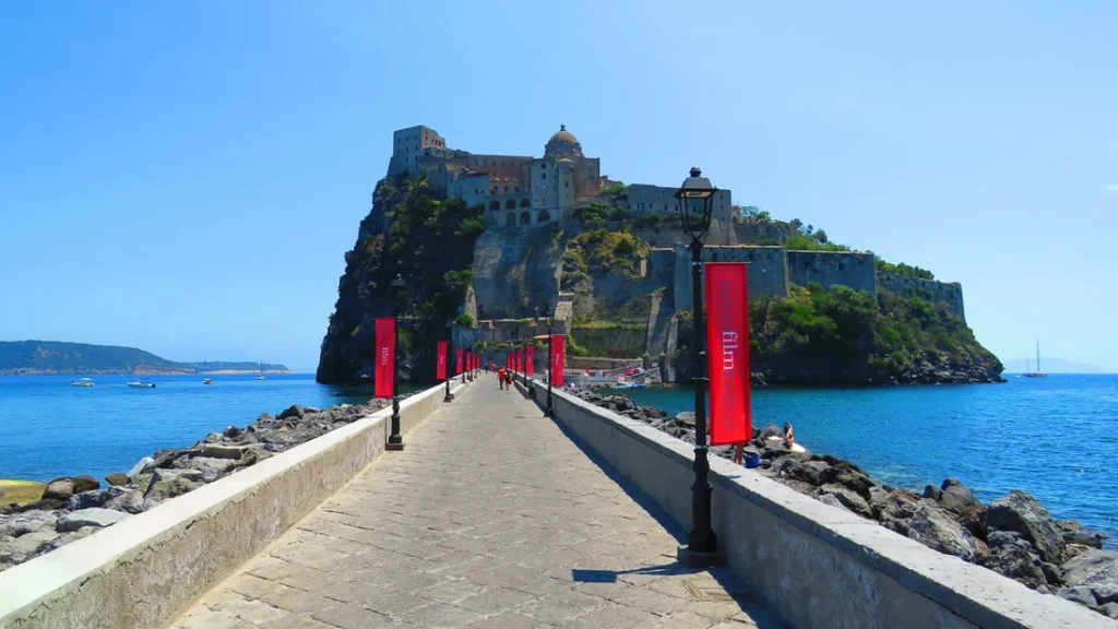 Potężny zamek Aragoński wyrastający prosto z morza, połączony wąskim mostem, pod którym rybacy naprawiają sieci swoich kolorowych łodzi.