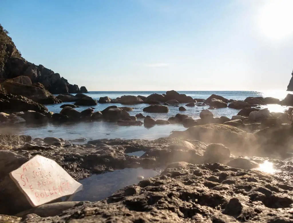Kamienista zatoczka z wrzącymi źródłami termalnymi mieszającymi się z morską wodą, czyli naturalne jacuzzi w skalnych basenach pod klifami.