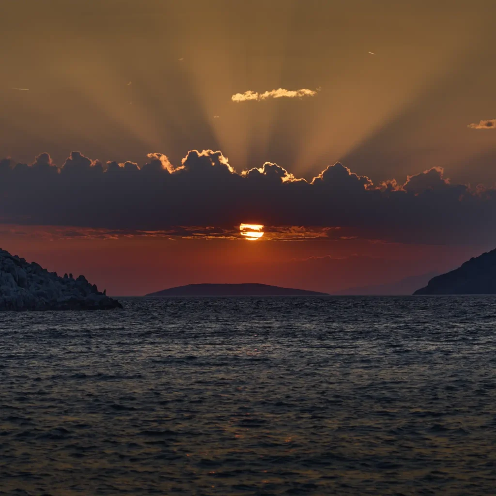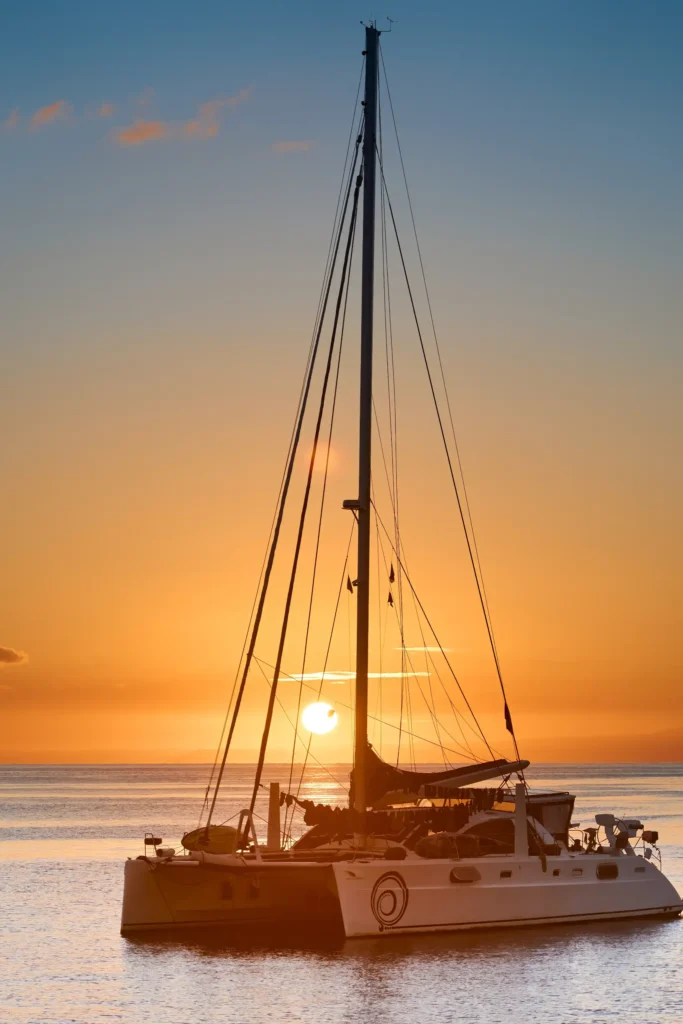 Z jachtu cumującego w zatoce widać, jak słońce rozlewa złote światło po falach – idealne miejsce na leniwe popołudnie i długie kąpiele w krystalicznej toni.
